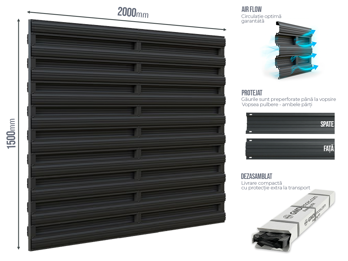 Dimensiunea standard de 2000mm x 1500mm este optimizata pentru eficienta in transport si montaj. Sectiunile pot fi combinate pentru a acoperi orice lungime de gard necesara, iar sistemul de asamblare cu nituri AL/INOX asigura conexiuni durabile si rezistente la coroziune.